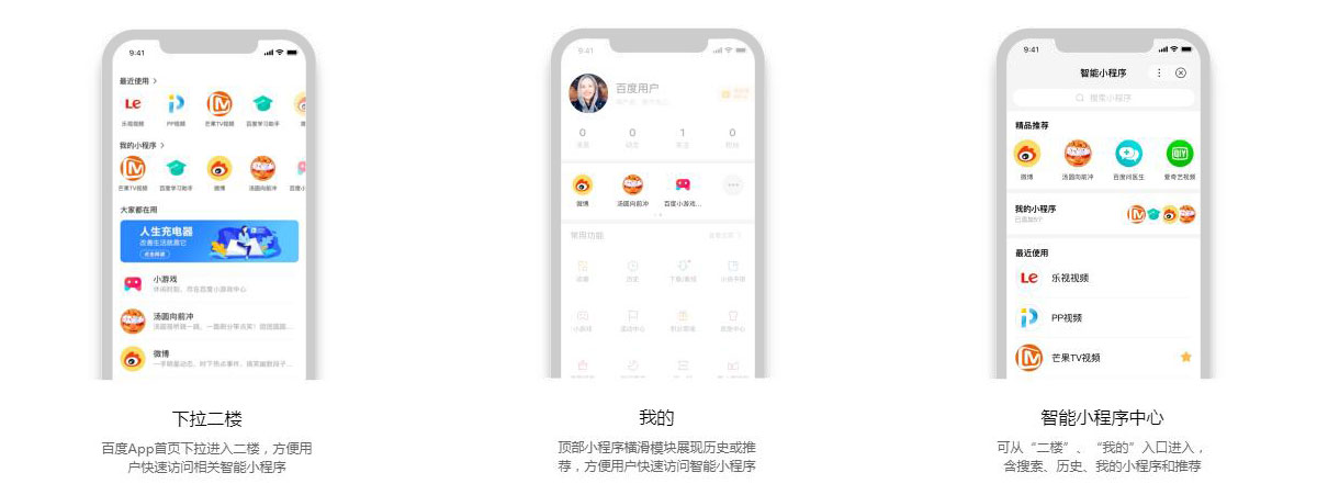 百度App首頁下拉進入二樓,方便用戶快速訪問相關智能小程序。頂部小程序橫滑模塊展現(xiàn)歷史或推薦,方便用戶快速訪問智能小程序??蓮摹岸恰?、“我的”入口進入,含搜索、歷史、我的小程序和推薦。